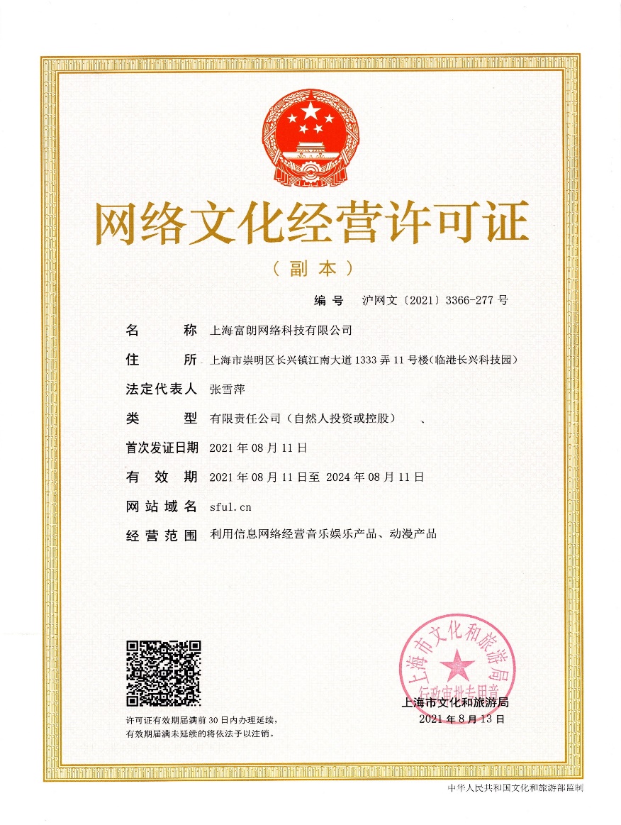 经营范围:利用信息网络经营音乐娱乐产品、动漫产品